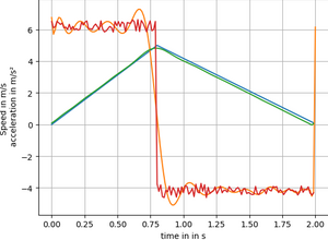Durch Laser-Schranken war abgesichert, dass die tatsächliche Geschwindigkeit uns bekannt ist. Der blaue Graph zeigt den tatsächlichen Verlauf der Geschwindigkeit. In rot erkennt man die gemessene Beschleunigung und orange die gefilterte Beschleunigung. Der grüne Graph stellt die errechnete Geschwindigkeit dar. Man erkennt, dass diese ziemlich nah beianander sind. Bei dem errechneten Weg ergibt sich ein Ergebniss, welches im Durchschnitt 0,15 Meter vom tatsächlichen Wert abweicht. | |||