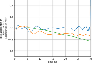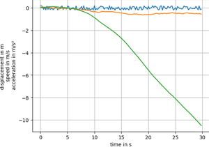 Falls man diesen Filter an diesselben Ausgangswerte anwendet, sieht man, das eine deutliche Verbesserung zu beobachten ist. In blau erkennt man das Rauschen des Beschleunigungsensors, welches dann in die Geschwindigkeit und in den Weg (Grün) überführt wird. Man sieht: Der Messwert beträgt -10 Meter (kann zufällig auch positiv sein). | |||