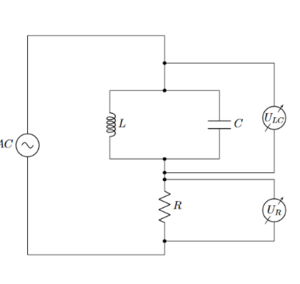 In unserem theoretischen Ansatz betrachten wir zuerst die Spannung $$U_{LC}$$ über den zueinander parallel geschalteten Spule (L) und einem Kondensator (C), während über dem Widerstand (R) die Spannung $$U_R$$ anliegt. Gemäß den Kirchhoffschen Gesetzen sollte die über der Spule und dem Kondensator abfallende Gesamtspannung $$U_{LC}$$ gleich der Spannung über der Spule $$U_L$$ und dem Kondensator $$U_C$$ sein, während die Spannung über dem Widerstand $$U_R$$ separat betrachtet wird: