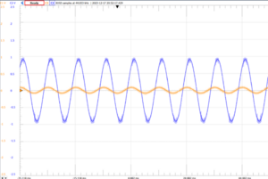 Mit Hilfe des Programs WaveForms konnten wir die Spannung, wie in Abbildung 2 gezeigt, messen. Dabei entstanden 2 Wellen, die die Spannung zeigten (Abbildung 4). Daraufhin haben wir so lange die Kreisfrequenz geändert, bis wir den Moment wo beide Wellen in Phase sind gefunden haben(Abbildung 5). Diesen Vorgang haben wir mit jedem Metall gemacht und sind auf folgende Ergebnisse gekommen