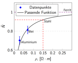 Diese packen wir nun in ein Diagramm wobei wir den spezifischen Widerstand auf der X-Achse und $$\tilde{N}$$ auf der Y-Achse haben (Abbildung 6). Beim Konstruieren eines Graphen durch diese Datenpunkte, erkennen wir, dass es eine Exponential Funktion sein könnte. Wenn der spezifische Widerstand 0 ist, würden unendlich viele Wirbelströme entstehen und $$\tilde{N}$$ wäre 0. Wenn der spezifische Widerstand jedoch unendlich groß wäre, würden keine Wirbelströme entstehen und $$\tilde{N}$$ wäre dementsprechend 1. Indem wir eine Exponential Funktion durch diese Datenpunkte durchgehen lassen, können wir auch das $$\tilde{N}$$ von den ferromagnetischen Kernen erfahren, da wir ja ihren spezifischen Widerstand kennen (Abbildung 7).