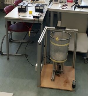 Der zweite Aufbau ist eine Art Drehplatte. Eine Drehplatte wurde auch von Stephan Herminghaus und seinem Team verwendet (Scheel M. u.a., 2008). Das Bohrgerät wird mit einer externen Spannungsquelle verbunden und betrieben. Wenn die Spannung hochgeregelt wird, fängt der Mülleimer an, sich um sich selbst zu drehen. In die Mitte des Tellers wird das Sand-Wasser-Gemisch in mithilfe einer Zylinder-Sandkastenform platziert. Außerdem ist am Rand des Mülleimers ein Klebebandstück als Blende befestigt. Ein Lasertachometer wird so ausgerichtet, dass der Laserstrahl, wenn der Mülleimer sich dreht, einmal pro Drehung das Klebebandstück trifft und zurückreflektiert wird. Das Tachometer erfasst wie häufig das Licht zurückreflektiert wird und zeigt so die Drehfrequenz des Mülleimers an (Skizze). Für den Versuch sind zwei Spannungsquellen à 30V in Reihe geschaltet, um eine Spannung von 60V zu erreichen, da 30V zur Beschleunigung des Sandes nicht ausreichend waren. Um die Gesamtspannung besser zu regulieren ist zusätzlich ein Spannungsmessgerät angeschlossen.