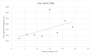 Während der Durchführung ist zu beobachten, dass sich die verschiedenen Sandarten unterschiedlich verhalten, wenn man Wasser beigibt. Sand aus der Region verhält sich im Gegensatz zu den anderen Sandarten hydrophob, das Wasser sickert nicht ein, sondern perlt vom Sand ab und bildet Rinnsale. Die Messungen mussten allerdings abgebrochen werden bevor der Sand zu Schlamm geworden ist, da der Sandzylinder als ganzes vom Teller gerutscht ist.