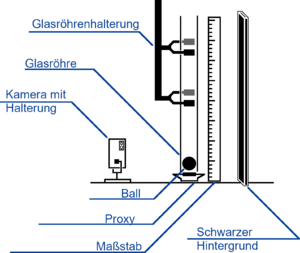 Unser Aufbau besteht aus einem Proxy, über welchem sich eine durchsichtige vertikale Röhre befindet, um die Flugbahn des sich in der Röhre befindenden Balles zu lenken. Die Röhre wird von zwei Klammern gehalten. Weiterhin haben wir eine Kamera mit Halterung, einen Maßstab und einen schwarzen Hintergrund für unsere Aufnahmen mit der Kamera. Die Kamera ist mit einem vernünftigen Abstand vom Proxy entfernt, sodass Parallaxe weitestgehend verhindert wird. Das bedeutet, dass die Kamera sich nicht zu nah am Aufbau befindet, um nicht nur einen kleinen Teil des Bereiches zu filmen, in welchem der Ball springt. Andererseits darf die Kamera nicht zu weit weg vom Aufbau platziert sein, um ein möglichst genaues Tracken zu ermöglichen. Hierbei ist jedoch die Parallaxe minimal. Man muss also zwischen Messbarkeit und Parallaxe abwägen.