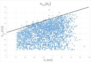 Bei besonders kleinen Werten von $$v_n$$ werden die Maxima keine Gerade bilden, sondern eine Kurve. Das liegt daran, dass Sprünge mit einer sehr geringen Geschwindigkeit nicht in der Lage sein werden, die Membran dann zu treffen, wenn sie am schnellsten ist, denn der Ball braucht länger als eine $$\frac{3}{4}$$ Periode, um eine Strecke von $$d_{max}$$ zurückzulegen.
