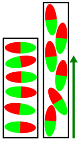 Zunächst gilt es zu erklären, warum der Ferritstab vibriert, also eine Auslenkung nach oben und unten Aufweist. Bei dem Anlegen eines Magnetischen Feldes in dem Ferritstab rotieren die Weiss'schen Bezirke in der Stange, weshalb sich die Länge der Stange verändert. Dieser Effekt wird Magnetostriktion genannt$$^{[1]}$$ und ist für die Längenveränderung verantwortlich. Beim Anlegen eines magnetischen Wechselfeldes mit einer Spule, welche mit Wechselspannung betrieben wird, bildet sich ein alternierendes magnetisches Feld aus. Daher verändert sich die Länge der Ferritstange periodisch.
