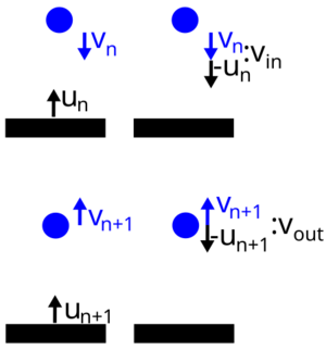 Um nun die Geschwindigkeit $$v_{n+1}$$, sprich die Geschwindigkeit des Balls nach dem Sprung, zu bestimmen, muss man die Geschwindigkeiten vor dem Sprung kennen. Als Erstes definiert man sich jedoch ein neues Bezugssystem, in dem man sich mit der Membran mitbewegt, diese also keine Geschwindigkeit besitzt. Daraus folgt, dass die Geschwindigkeit des Balls selbstverständlich verändert wird, weshalb sich folgende neue Ballgeschwindigkeiten für das Bezugssystem ergeben: $$v_{in} = -(v_n - u_n) = -v_n + u_n$$ sowie $$v_{out} = v_{n+1} - u_{n+1}$$. | |||