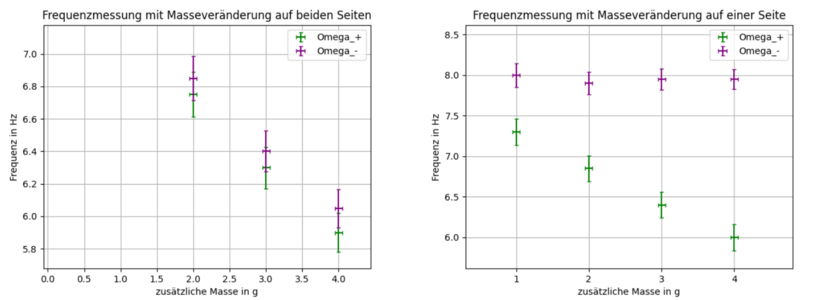 Ändert man beide Massen, so besagt unsere Theorie, dass beide Frequenzen geringer werden, nun tun sie das auch wie man im Diagramm sieht.