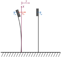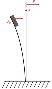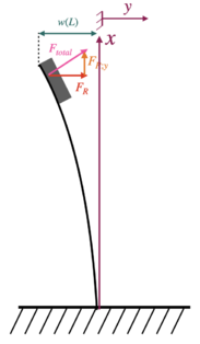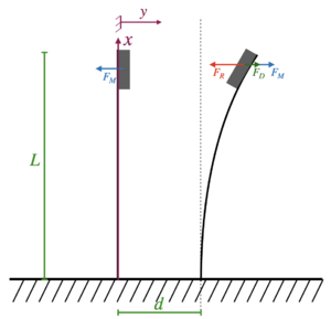 In diesem Fall Betrachen wir die Schwingung einer ungedampften Blattfeder mit Masse am Rand. Um diese zu beschreiben verwenden wir Newton'sche DGLs, welche man erhält, indem man die auf eine Punktmasse wirkenden Kräfte summiert. Das einzige problem ist, dass wir keine Punktmasse haben. Dies kann man jedoch umgehen, indem man eine effektive Masse berechnet, doch mehr dazu später. Da bei der freien Biegeschwingung, die einzige wirkende Kraft die Rückstellkraft ist gilt hier: