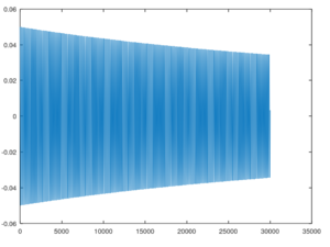 Dadurch erhalten wir Plots, wie den neben stehenden, jedoch ist die Dämpfung bei diesen sehr gering für den beschriebenen Fall, mögliche Ursprünge dieser Abweichung, sind, dass wir einen Einheitenfehler in der Simulation haben, oder, dass wir einen großen Teil der Dämpfung vernachlässigen, jedoch haben wir den Ursprung des Fehlers noch nicht gefunden.