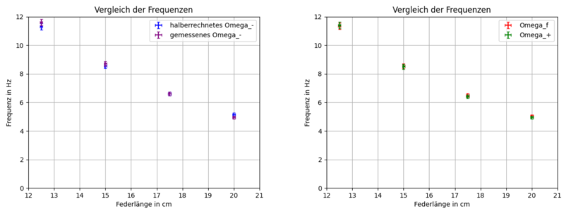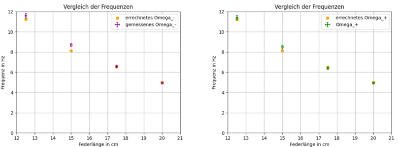 Um die Frequenz zu untersuchen, haben wir die Federlänge, die Distanz zwischen den Magneten, sowie die Masse der Magneten variiert, sodass wir sowohl den Einfluss der Magnetkraft, als auch den der Rückstellkraft variieren können. Als die Werte, die wir anhand der Theorie bestimmen, haben wir anhand der vereinfachten Theorie berechnet, da diese uns exakte Formel liefert, daher haben wir hier auch nicht die Dämpfung berücksichtigt.