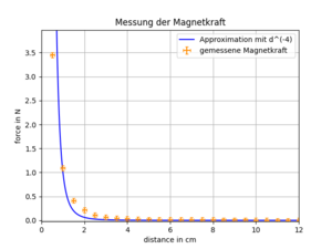 Auch hier stimmt die Theorie nicht schlecht mit unseren Messwerten überein, jedoch waren wir nicht imstande für größere Längen mithilfe des Kraftmessers die Magnetkraft zuberechnen, da diese bei 4cm schon sehr schwach ist, sodass wir bei den letzten Werten ein sehr hohes Rauschen haben, und diese nicht mehr aussagekräftig sind, daher ist unser Koeffizient auch verfälscht, sodass auch unsere Simulation nicht funktioniert.