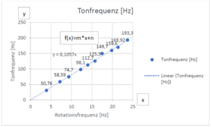 Die Tonfrequenz fton ist proportional zur Rotationsfrequenz fdreh der Scheibe. Der Proportionalitätsfaktor n muss experimentell ermittelt werden.