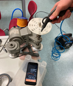 Das ist der Aufbau für die Messungen vom Versuch (Abbildung 2). Ein Elektromotor erzeugt die Rotation. Die erstellte Bohrschablone ist an diesem befestigt. Die Anordnung der Bohrungen auf den konzentrischen Kreisen der Scheibe ist bei diesem Versuch symmetrisch. An dem Kompressor ist eine Druckluftpistole mit einem Schlauch (blau) angeschlossen. Aus dieser kommt ein Luftstrom.