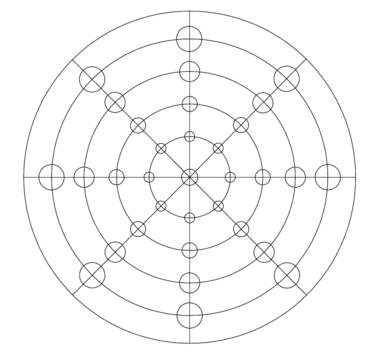 Erst wird eine Bohrschablone erstellt (Abbildung 1). Um eine möglichst regelmäßige Bohrschablone zu erstellen, wird ein Zeichenprogramm, wie zum Beispiel AutoCAD verwendet. Damit wurde eine Schablone mit 8 Bohrungen pro Kreis erstellt, die in 4 konzentrischen Kreisen angeordnet sind (siehe Abbildung 1). Die Parameter der Scheibe sind die konzentrischen Kreise, beziehungsweise deren Durchmesser, die Anzahl der Bohrungen und deren Durchmesser. Die Anordnung der Bohrungen ist symmetrisch.