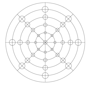 Erst wird eine Bohrschablone erstellt (Abbildung 1). Um eine möglichst regelmäßige Bohrschablone zu erstellen, wird ein Zeichenprogramm, wie zum Beispiel AutoCAD verwendet. Damit wurde eine Schablone mit 8 Bohrungen pro Kreis erstellt, die in 4 konzentrischen Kreisen angeordnet sind (siehe Abbildung 1). Die Parameter der Scheibe sind die konzentrischen Kreise, beziehungsweise deren Durchmesser, die Anzahl der Bohrungen und deren Durchmesser. Die Anordnung der Bohrungen ist symmetrisch.