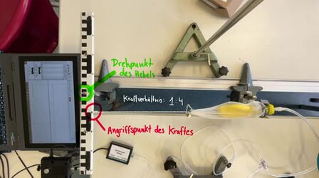 Der Aufbau im unten dargetellten Abb3 waren unsere ersten Ideen um die Umsetzbarkeit des Systems zu prüfen und auch die maximale mögliche Kraft herauszufinden, wobei wir aber später merkten, dass die maximale Kraft des Netzes, die des Kraftmessers übertraf. Also erweiterten wir den Aufbau über 2 Tische hinweg mit einem Hebel ( siehe Abb4 ). Zudem merkten wir auch, dass verschiedene Netze verschiedene Zugkräfte erwiesen, also probierten wir mehrere aus und entschlossen uns auf das Netz der Marke "Reine", die eine maximale Zugkraft von über 50 Newton erwies.