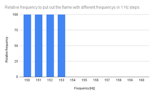 In einem weiteren Versuch testeten wir, wie lange die Kerze bei verschiedenen Frequenzen benötigt, um komplett zu erlöschen. Dabei schauten wir uns den Bereich zwischen 125 Hz und 150 Hz an. Um an die Messwerte zu kommen, haben wir die den Versuch mit einer High-speed-Kamera aufgenommen und später ausgewertet. Aus den Datenreihen konnten wir keine große Veränderung der Zeit des Ausgehens feststellen. Dabei kann man sehen, dass die Dauer bei allen Werten maximal 0,45 Sekunden war. Jedoch müssen wir auch sagen, dass alle Werte bei einer Frequenz von 145 Hz in einem deutlich engeren Bereich waren als bei allen anderen untersuchten Frequenzen. Dieses Verhalten müsste nochmal mit weiteren Messungen überprüft werden.