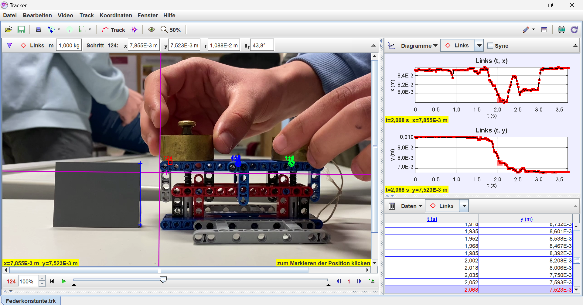 Ein importiertes Video in das Programm Tracker. Hier wird gezeigt, wie die Auswertung der Federkonstante durchgeführt wird.