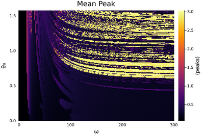 Um das Verhalten des Pendels besser verstehen zu können, wird über ein Frequenzspektrum und ein Anfangsauslenkungsspektrum iteriert und für jede Kombination das Pendel simuliert. Nun wird aus den Auslenkungsdaten der Simulation die lokal maximalen Auslenkungen bestimmt (Maximalauslenkungen - Auslenkung, wo das Pendel kurzzeitig zum Stillstand kommt). Diese können nun in zwei verschiedenen Weisen visualisiert werden. Im ersten Diagramm wird die durchschnittliche Maximalauslenkung als Farbe dargestrellt (je heller desto größer). Weiter wird im zweiten Diagramm die Standardabweichung dieser Maximalauslenkungen analog farblich dargestellt.