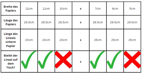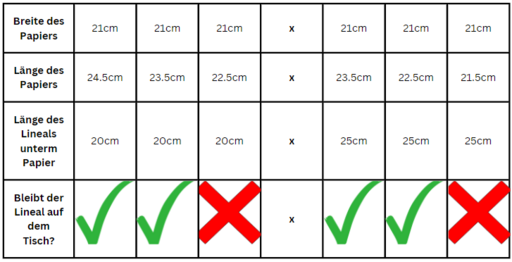 Etwas ähnliches können wir auch bei der minimalen Länge sehen. Die minimale Länge für 20cm vom Lineal unter dem Papier liegt zwischen 22,5cm und 23,5cm. Bei 25cm vom Lineal unter dem Papier liegt die minimale Länge zwischen 21,5cm und 22,5cm. Hier nimmt die minimale Länge auch ab, jedoch nicht so stark wie bei der minimalen Breite. Der Grund ist, dass wenn ein zu großer Teil vom Lineal hinter dem Papier rausschaut, das Lineal das Papier einfach anhebt und wie eine Art Hebel wirkt. Deshalb ist wichtig zu sagen, dass das Papier länger sein sollte als das Lineal.