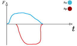 Die linke Skizze zeigt das ungefähre Verhalten der Kräfte über ein Zeit, die wir erwarten würden. Während der Kontaktzeit zwischen dem Ball und dem Lineal übt der Ball eine Kraft auf das Lineal aus. Das Lineal drückt danach einen bestimmten Bereich des Papiers hoch. Diese Kraft($$F_u$$), die das Lineal auf das Papier ausübt, können wir messen. Damit das Papier auf den Tisch bleibt muss die Kraft vom Druck größer oder gleich der Kraft des Lineals, dass nach oben drückt, sein: $$F_p >= F_u$$. Dann wirkt nämlich eine Gesamtkraft in den Tisch rein oder die Kräfte neutralisieren sich. Wenn $$F_p < F_u$$, dann wirkt eine Gesamtkraft vom Tisch weg und das Blatt wird nach oben gedrückt, weshalb die Luft genug Zeit hat, um unter das Papier zu fließen. Dadurch wird der Druckunterschied kleiner bzw. gleich, weshalb es keine bzw. eine zu kleine Druckkraft gibt, weshalb das Lineal runter fällt.