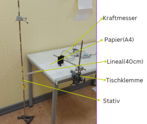 Zur Messung der Kraft, die das Lineal auf das Papier ausübt $$(F_u)$$ haben wir ein Messgerät mithilfe einer Tischklemme am Tisch befestigt.