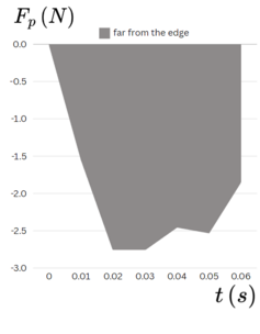 Man kann erkennen, dass die Differenz zwischen den Kraft "Peak" von dieser Messung und der von dem Loch weit von der Tischkante relativ groß ist. Man kann ebenfalls erkennen wie die Kraft rapide ansteigt, um bei 0,04s den "Peak" zu erreichen. Danach sinkt die Kraft schnell auf einen im Vergleich niedrigen Wert.ㅤ