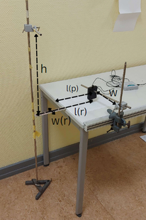 Unser Grundaufbau besteht ledeglich aus einem Metalllineal, was 40cm lang ist, und einem A4 Papier$$(29,5cm \cdot 21cm)$$. Als Ball haben wir immer einen Tennisball genutzt, der 60,6g gewogen hat. Weiterhin stand ein Stativ stets da, damit wir immer von der selben Höhe werfen konnten. Das Lineal war bei unseren Messungen stets zur Hälfte unter dem Papier und hälfte über der Tischkante. Letzteres haben wir nur einmal geändert, als wir geschaut haben, wie groß die minimale Länge und Breite des Papiers ist. Mit diesem Aufbau konnten wir jedoch nicht viele Messwerte kriegen, sondern nur schauen , ob das Lineal auf dem Tisch bleibt oder nicht und die minimale Länge und breite des Papiers.