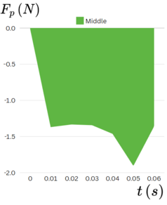 Diese haben wir rechts im Diagramm aufgetragen. Man kann erkennen, dass die Kraft größer wird, bei 0,4sek ihren Hochpunkt erreicht und dann wieder abflacht.